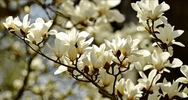 玉蘭是高大的喬木,常栽植在園林里的層層院落里。初春開花時,滿樹點點白花,盛花時若雪濤落玉,瑩潔清香,蔚為奇觀。